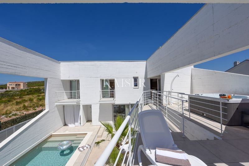 Vila se temelji na čistom volumenu bijele boje, s naglaskom na funkcionalnost i vizualnu jasnoću. Ogradni zidovi stvaraju introvertirani dvorišni prostor koji postaje dio kuće, omogućujući prožimanje unutarnjeg i vanjskog prostora, što je ključno za život na otvorenom u dalmatinskom podneblju .