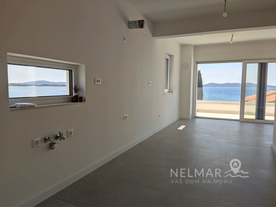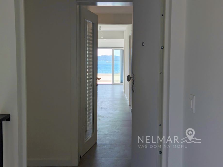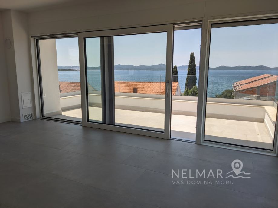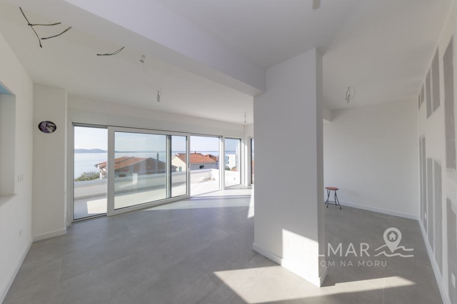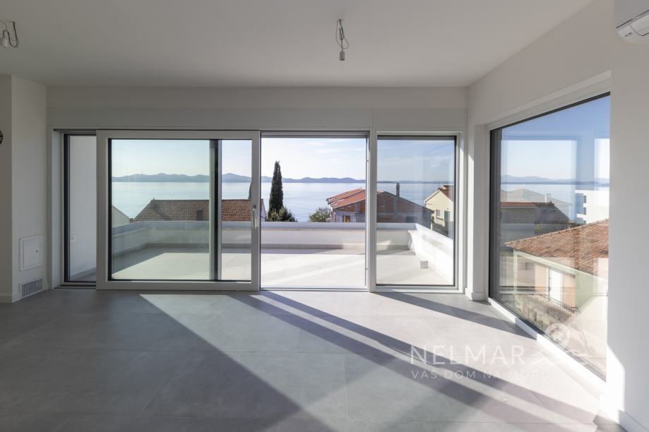 Das moderne Penthouse mit der Bezeichnung S3 befindet sich im zweiten Stock und umfasst eine Fläche von 88,18 m2 und besteht aus einer Eingangshalle und einem Flur, der den Wohnbereich vom Schlafbereich der Wohnung trennt. Der Schlafteil der Wohnung besteht aus zwei Schlafzimmern, die sich ein Badezimmer teilen, und einem Hauptschlafzimmer mit eigenem Bad. Die Zimmer sind mit langen französischen Fenstern dekoriert, die dem gesamten Raum Licht und Luftigkeit verleihen. Der Wohnbereich der Wohnung besteht aus Gäste-WC, Waschküche, Küche, Esszimmer und Wohnzimmer in großzügiger „Open Space“-Ausführung. Eine große durchgehende Glaswand verbindet den Innenraum mit einer großen überdachten Terrasse. Die Treppe führt zu dem Teil, wo sich eine Sauna mit einem Fenster mit Blick auf das Meer und einem Ausgang zur Dachterrasse befindet, wo sich ein großer Whirlpool von 6 Metern Länge mit freiem Blick auf den Archipel von Zadar befindet. In der Ecke der Dachterrasse befindet sich eine moderne Außendusche, die mit Perlmutt-Mosaik verziert ist und roof-pool.