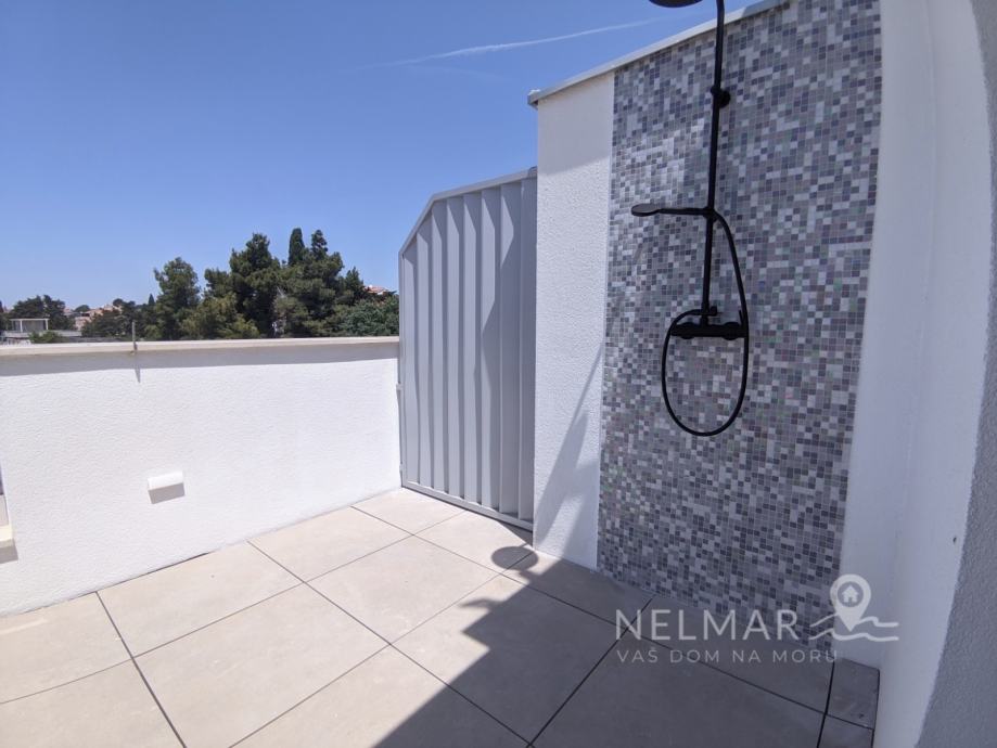 The modern penthouse marked S3 is located on the second floor and covers an area of 88.18 m2, and consists of an entrance hall and hallway, which separates the living area from the sleeping area of the apartment. The sleeping part of the apartment consists of two bedrooms that share a bathroom and a master bedroom with en suite bathroom. The rooms are decorated with long French windows that give light and airiness to the whole space. The living part of the apartment consists of a guest toilet, laundry, kitchen, dining room and living room in a spacious "open space" version. A large full-length glass wall connects the interior with a large covered terrace. The stairs lead to the part where there is a sauna with a window overlooking the sea and an exit to the roof terrace where a large jacuzzi 6 meters long with an unobstructed view of the Zadar archipelago. In the corner of the roof terrace there is a modern outdoor shower, which is decorated with mother-of-pearl mosaic and a roof-top pool.