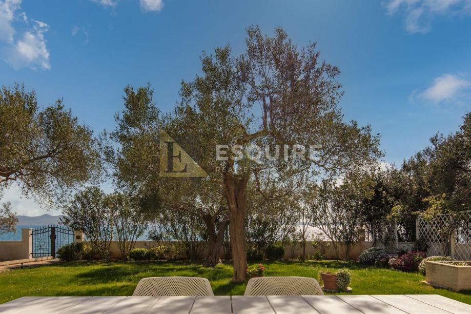 Uređeno dvorište s mediteranskim biljem, maslinama i prostorom za druženje dodatno naglašava osjećaj privatne oaze uz more.