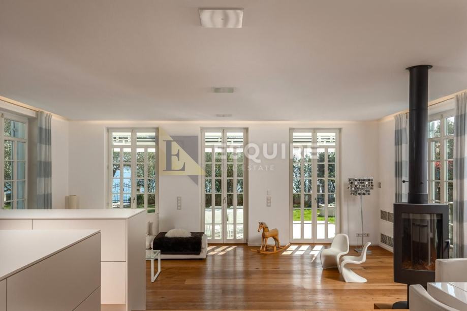 Vila se prostire na 500 m² zemljišta, dok 210 m² pažljivo osmišljenog interijera nudi prozračne, svijetle prostore orijentirane prema moru. Prostrani dnevni boravak s kaminom, blagovaonica i moderna kuhinja čine impresivan open-space prostor s direktnim izlazom na terasu i vrt.