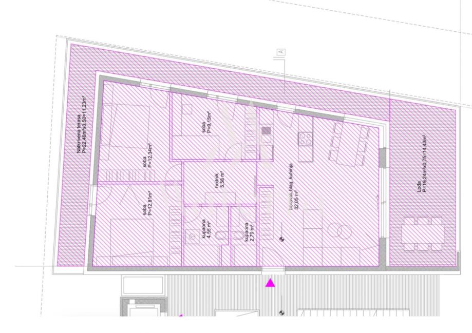 Stan je jugoistočne orijentacije i sastoji se od hodnika, dnevnog boravka s kuhinjom i blagovaonicom, tri spavaće sobe i dvije kupaonice. Neto korisna površina stana iznosi 79,28 m². Dodatno mu pripada natkrivena terasa (11,23 m²), lođa (31,17 m²), spremište (1,77 m²) te dva garažna parkirna mjesta, ukupne površine sa svim pripadcima 138,63 m².