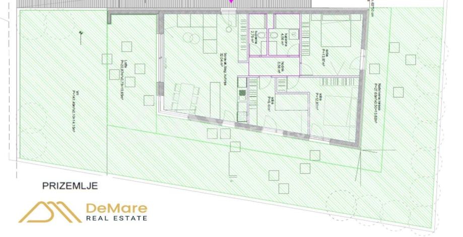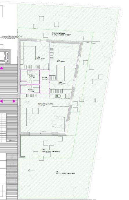 Iz dnevnog boravka se izlazi na vanjske natkrivene terase i prekrasan prostrani vrt (141 m2) koji okružuje stan sa tri strane, a u podrumu zgrade se nalaze i 2 pripadajuća garažna parkirna mjesta (13,75 m2 +13,75 m2).