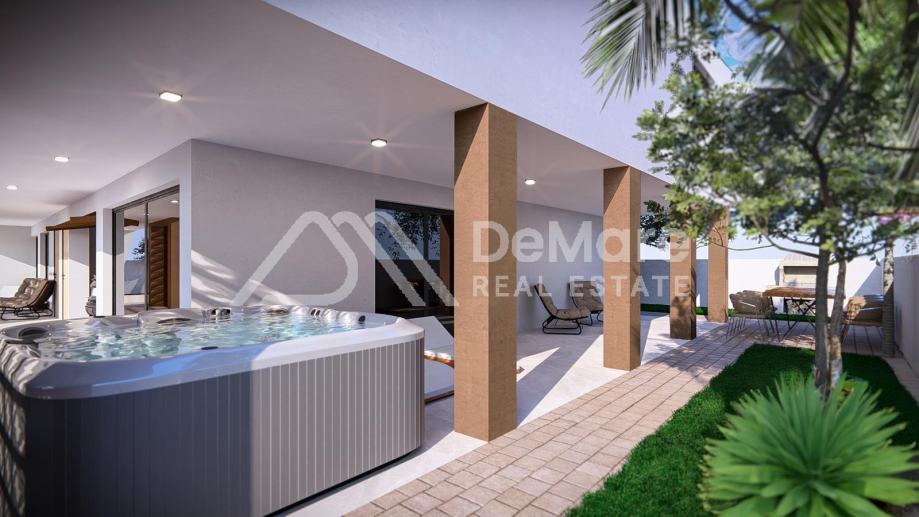 U prizemlju se nalazi ulazni prostor, dnevni boravak s kuhinjom, blagovaonica, toalet i praonica. Iz dnevnog boravka se izlazi na natkrivenu terasu s bazenom, oko kojega se nalazi vrt i sunčalište.