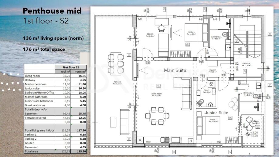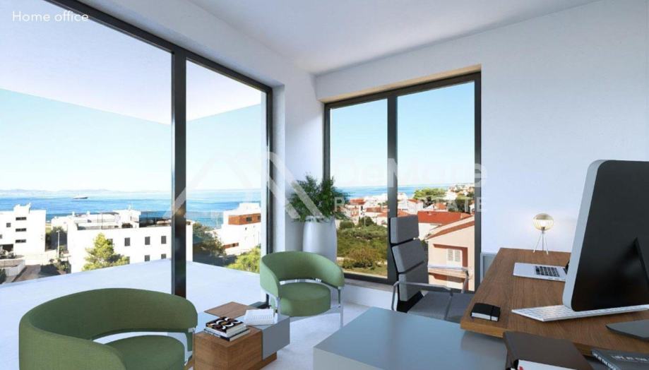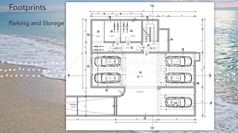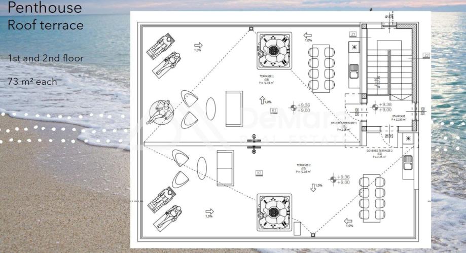 Na vrhu zgrade nalazi se prekrasna prostrana krovna terasa (cc. 72 m2) s panoramskim pogledom na more, na kojoj se može postaviti ljetna kuhinja, komin i masažni bazen, outdoor namještaj, te ostali sadržaji prema željama kupca. Stanu također pripadaju dva garažna parkirna mjesta (2 x 13,75 m2) kao i spremište u podrumu zgrade (9,30 m2).