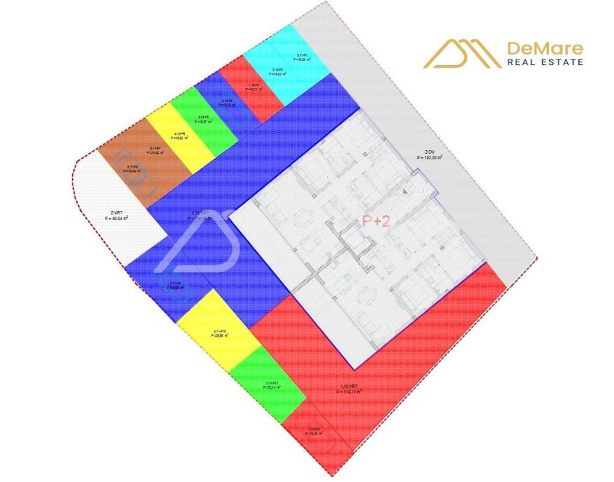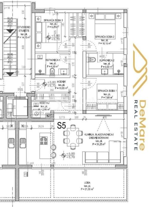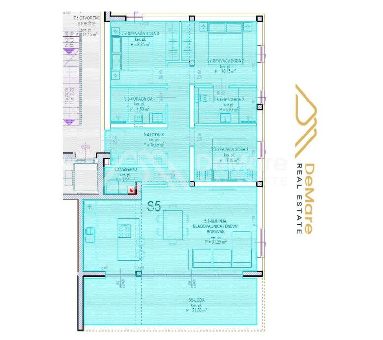 Stanu također pripada prekrasna natkrivena lođa (21,30 m2) i 2 vanjska parkirna mjesta (14,49 m2 + 14,25 m2) .