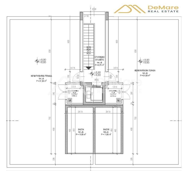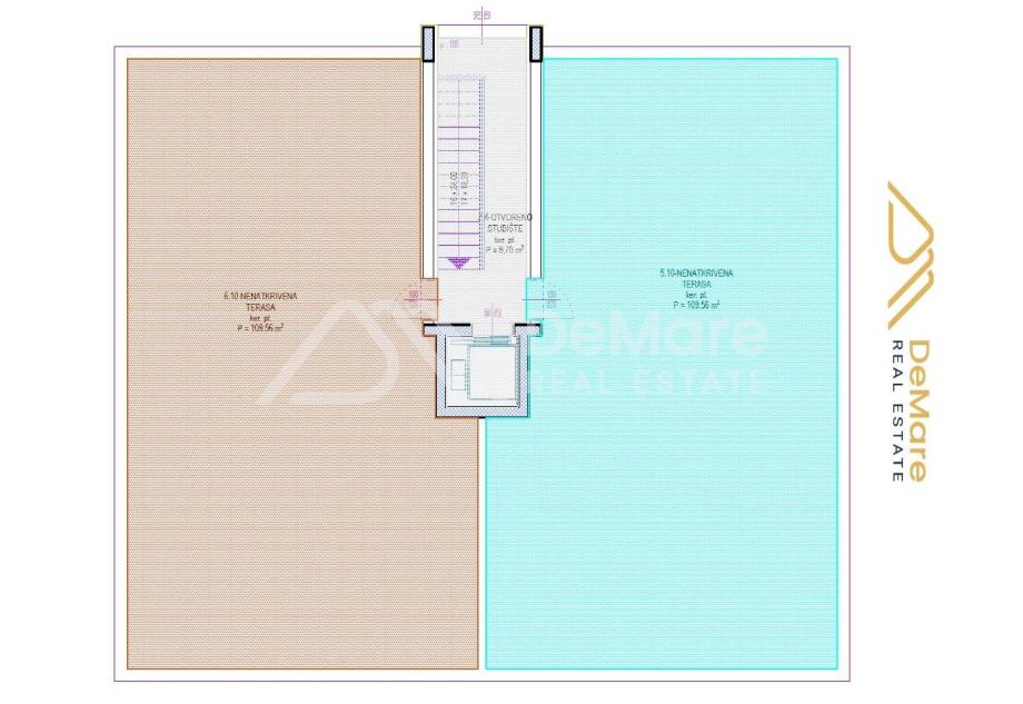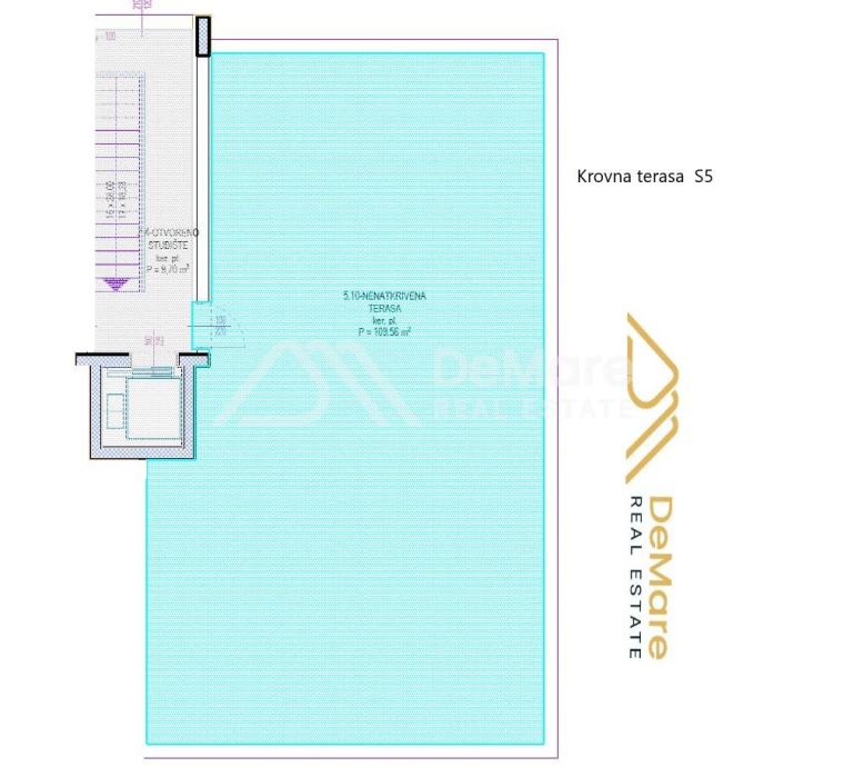 Iznad stana nalazi se prostrana krovna terasa površine 91,80 m2, s panoramskim pogledom na more i otoke, gdje je postavljen bazen (cca. 12 m2) , i na kojoj se mogu urediti dodatni razni sadržaji za boravak na otvorenom, prema željama budućih vlasnika.