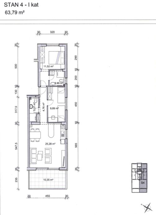 U ponudi je stan S4, smješten na 1. katu zgrade, a sadrži hodnik, dvije spavaće sobe, dvije kupaonice, dnevni boravak s kuhinjom i blagovaonicom te prostranu lođu s pogledom na more. Stambena površina stana S1 iznosi 63,79 m2.