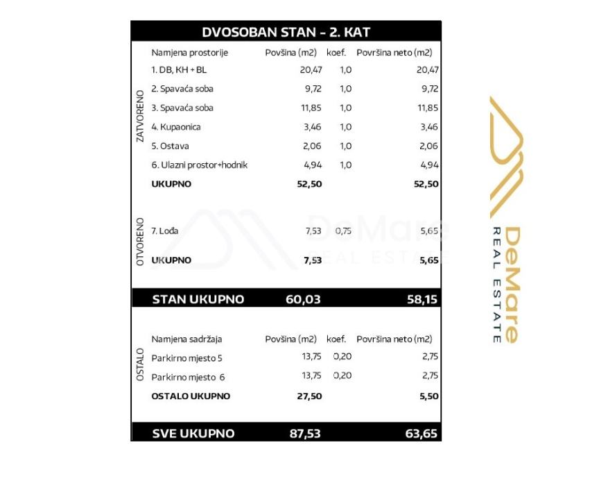 Stanu također pripadaju i 2 vanjska parkirna mjesta (2 x 13,75 m2).