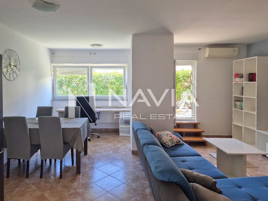 Stan se nalazi u polusuterenu i ima vrlo funkcionalan raspored. Sastoji se od ulaznog predsoblja koje vodi u hodnik, dvije spavaće sobe, kupaonice te prostranog dnevnog boravka povezanog s kuhinjom i blagovaonicom. Iz dnevnog dijela izlazi se na natkrivenu terasu, a odmah uz nju nalazi se mali privatni vrt koji pruža dodatni prostor za odmor ili uređenje prema vlastitim željama.