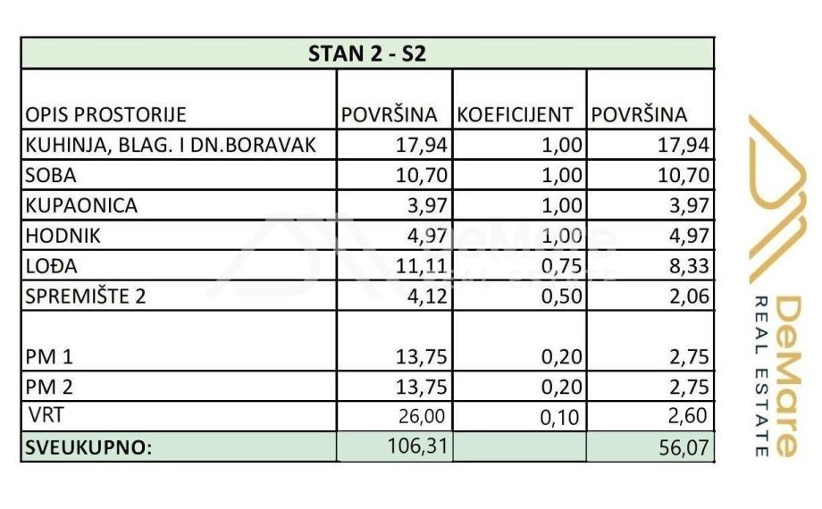 Ukupna korisna obračunska vrijednost površine stana iznosi 56,07 m2.