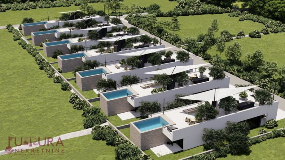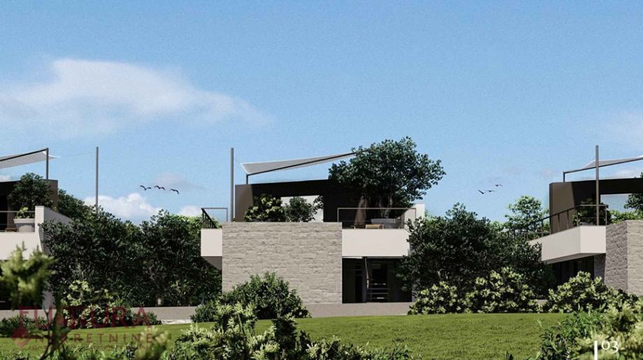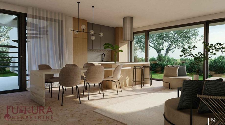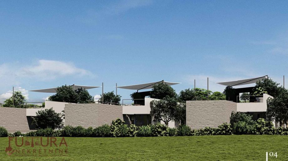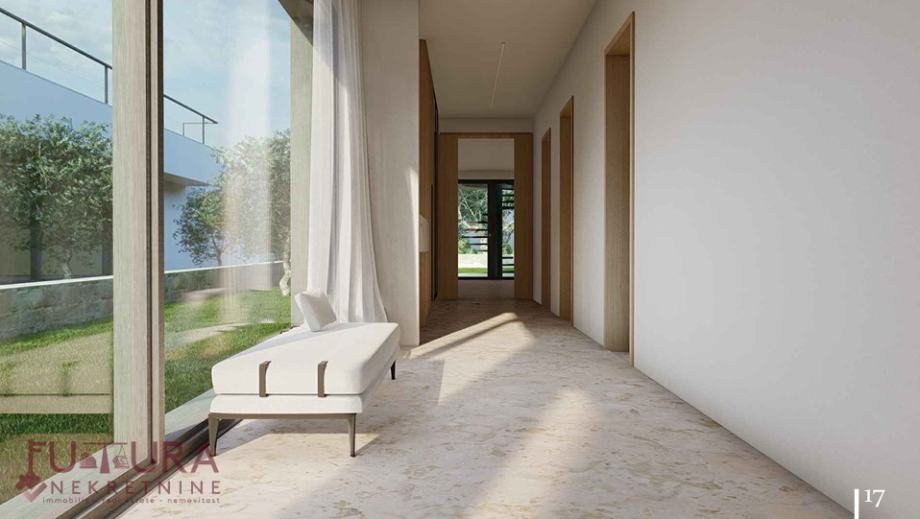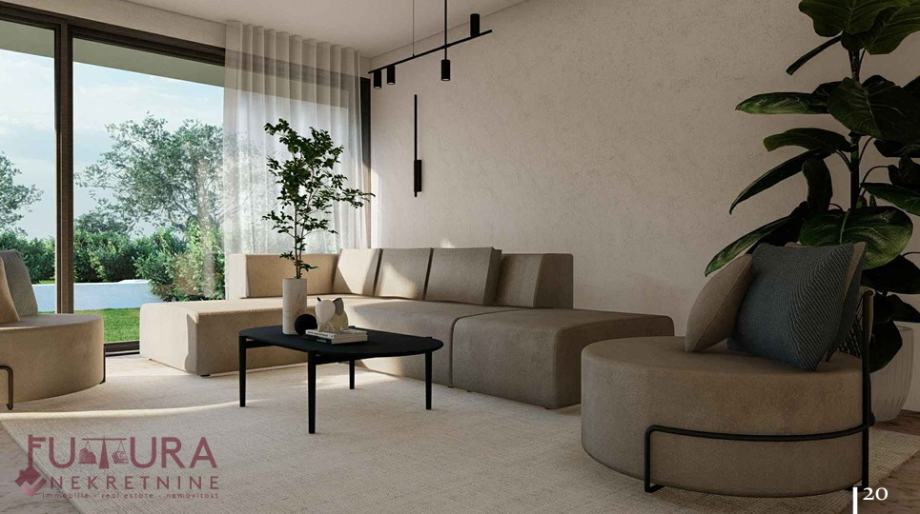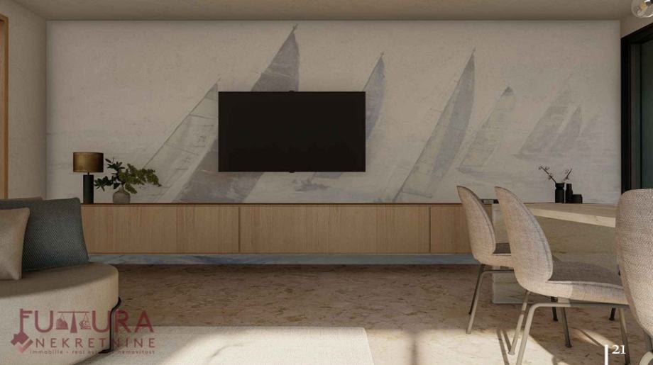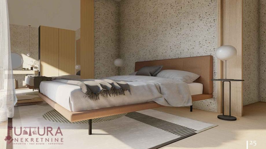 Sastoji se od: tri spavaće sobe, dnevnog boravka + kuhinja + blagovaona, hodnika, tri kupaonice i terase.