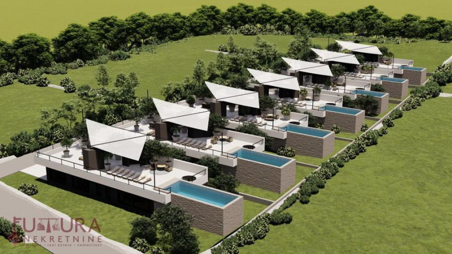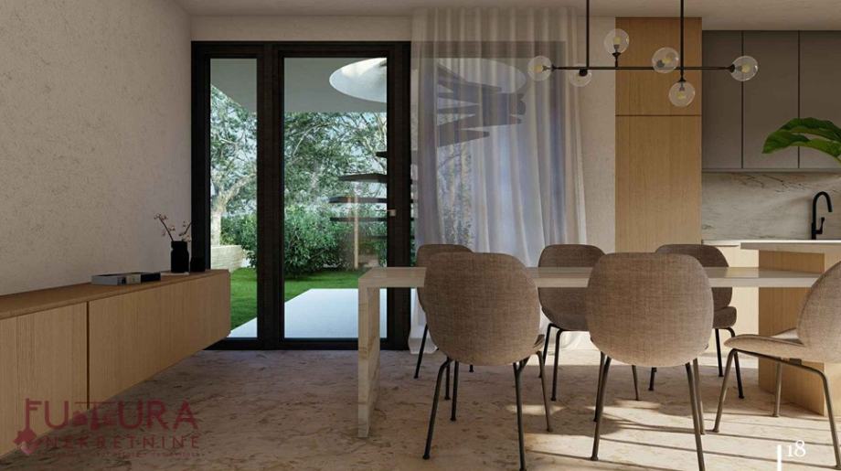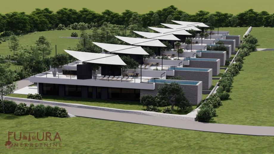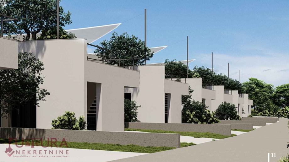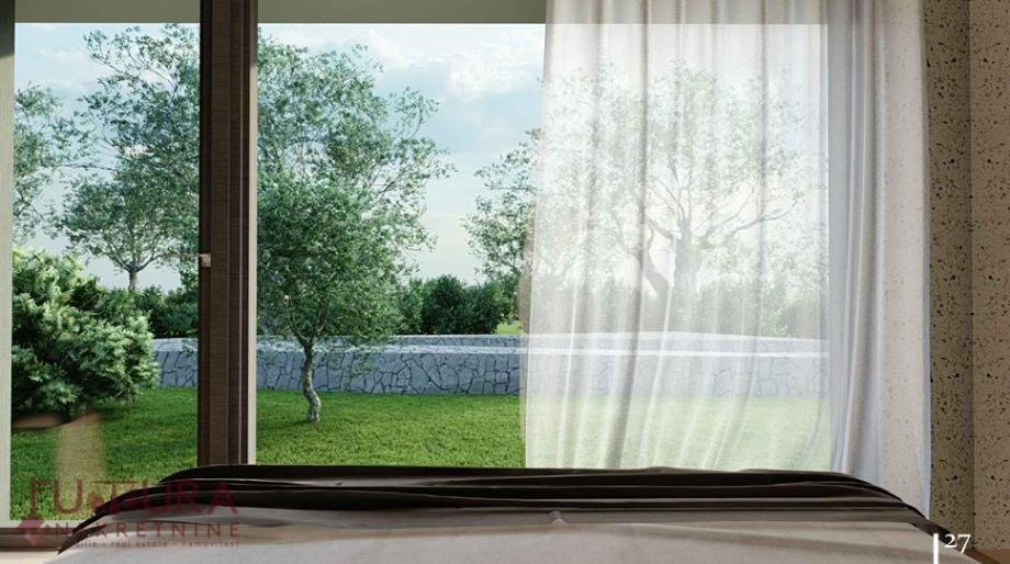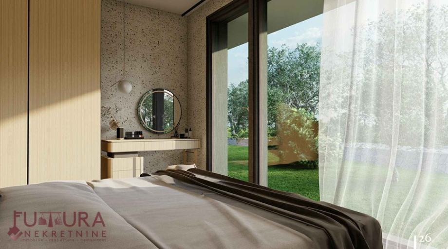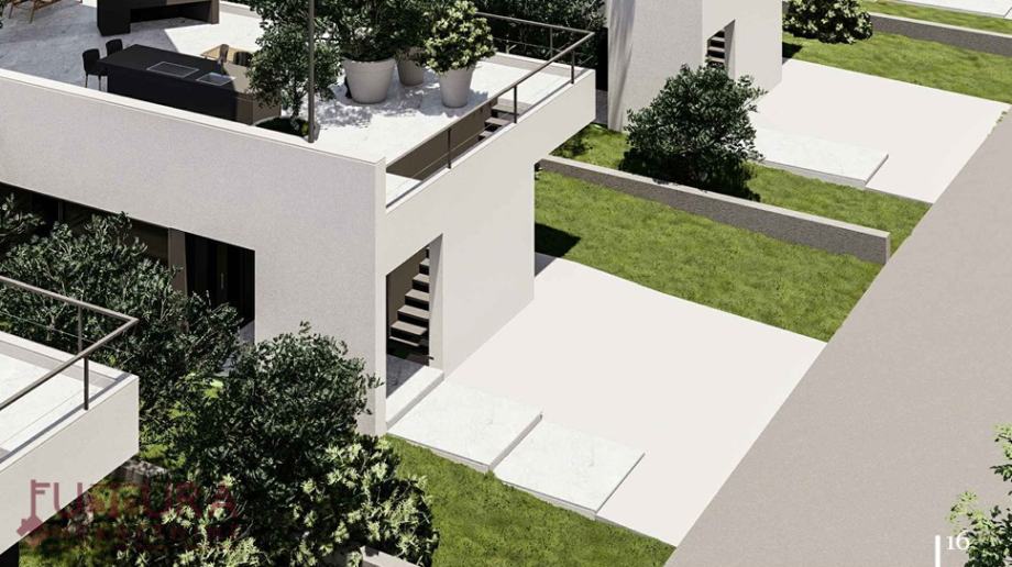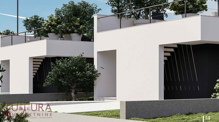 Sastoji se od: tri spavaće sobe, dnevnog boravka + kuhinja + blagovaona, hodnika, tri kupaonice i terase.