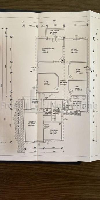 Stan se sastoji od hodnika, dnevnog boravka, kuhinje, blagavaonice, sobe 1., sobe 2., sobe 3., kupaonice, wc-a, sobe 4., sobe 5, kupaonice i wc-a, korisne površine 151,77 m2