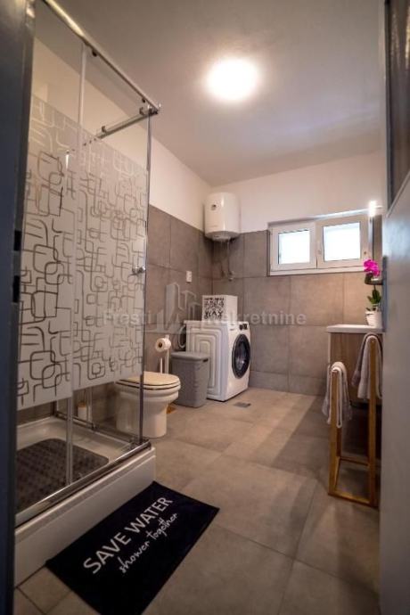 Prodaje se komforan, jako lijepo namješten stan na atraktivnoj lokaciji Jazine, Zadar. Stan se prostire na 86 m² stambenog prostora i 141m2 okućnice. Nudi savršen spoj udobnosti i funkcionalnosti. Sastoji se od prostranog otvorenog dnevnog boravka s blagovaonicom i moderno opremljene kuhinje, dvije udobne spavaće sobe, dvije kupaonice s kadom, tušem i toaletom, prostranog hodnika, opreme za roštilj i terase. Stan je kompletno opremljen kvalitetnim uređajima . Sve instalacije (struja, voda) su nove. Visokokvalitetni materijali koriste se u cijelom stanu, odlični prozori i vrata.