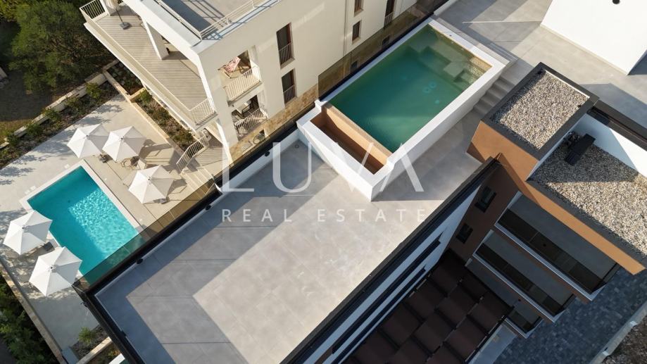 Ovaj penthouse posebnim čini to što posjeduje prostranu krovnu terasu koja je opremljena infinity bazenom, te ima neometan panoramski pogled na more i otoke.
