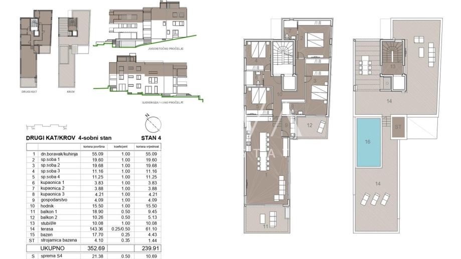 Nalazi se na drugom katu iznimno kvalitetne zgrade s ukupno četiri stana, a sastoji se od dnevnog boravka s open space kuhinjom i blagovaonicom, četiri prostrane spavaće sobe, tri kupaonice, dva balkona, prostorije za gospodarstvo i hodnika.
