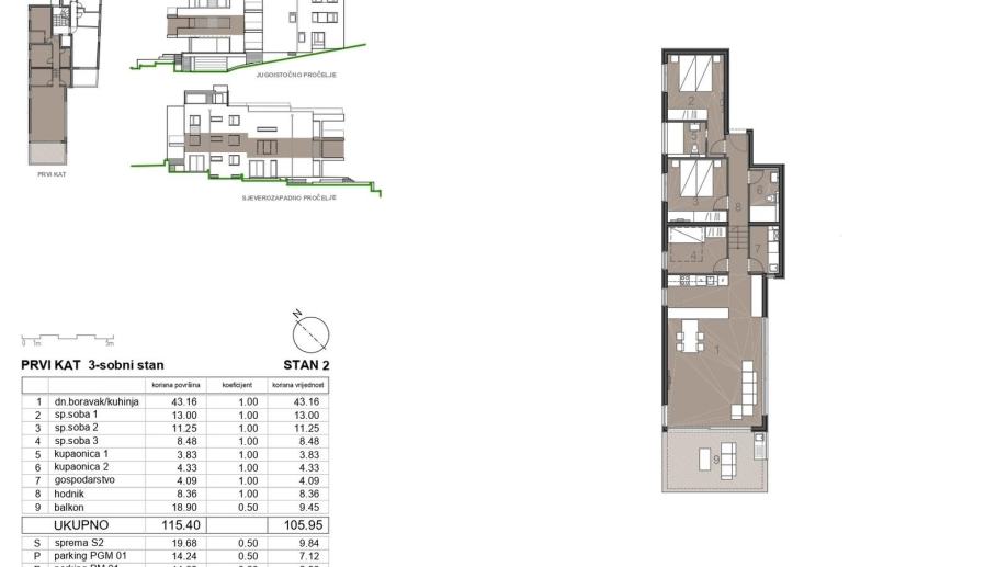 Nalazi se na prvom katu novoizgrađene zgrade s liftom, a sastoji se od dnevnog boravka s open space kuhinjom i blagovaonicom, tri prostrane spavaće sobe, dvije kupaonice, balkona, spremišta i hodnika.