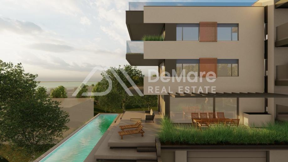 Prodaje se luksuzan stan s bazenom u NOVOGRADNJI sa ukupno 4 stambene jedinice, na izuzetnoj lokaciji - treći red do mora, svega 100 metara udaljenosti do mora i plaže. Objekt se sastoji od podruma, prizemlja, prvog i drugog kata, te prostrane krovne terase koja ima prekrasan panoramski pogled na more i otoke. Sve etaže su povezane liftom.
