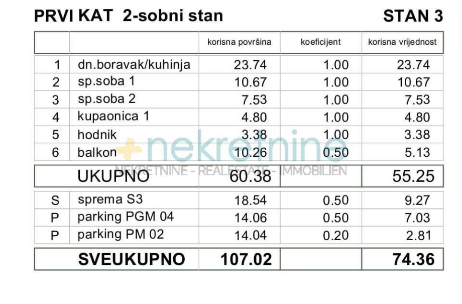 Stan ima neto korisne obračunske površine od 74,36 m2.