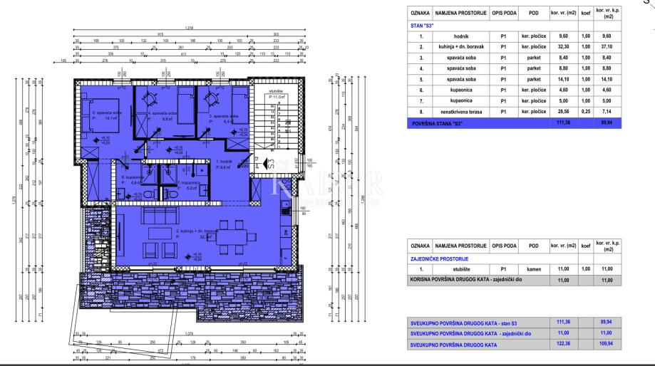 Stan se prostire na 124 m² stambene površine, a sastoji se od prostranog dnevnog boravka s kuhinjom i blagovaonicom, tri spavaće sobe (od kojih glavna ima vlastitu kupaonicu i walk-in ormar), te dodatne kupaonice. Iz dnevnog boravka izlazi se na balkon, a unutarnjim stubištem dolazi se do privatne krovne terase s jacuzzijem koja je idealna za sunčanje, druženja, opuštanje i ugradnju vanjske kuhinje. Tlocrt sa rasporedom i površinama se nalazi među slikama