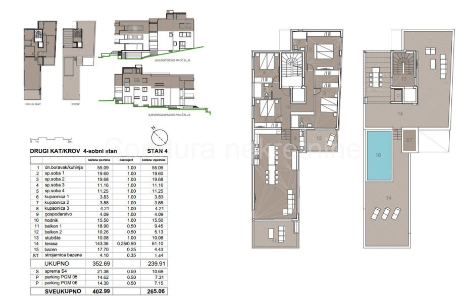 Neto stambena površina iznosi 265 m², dok ukupna korisna površina s terasama doseže 404 m².