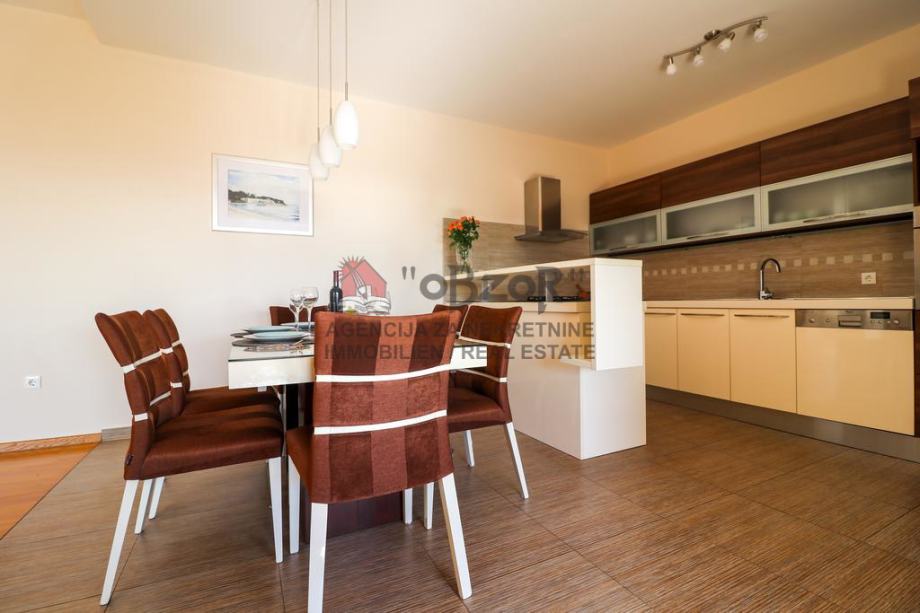 Na katu se nalazi jedan komforan trosoban stan koji se sastoji od kuhinje s blagavaonom i dnevnim boravkom, hodnika, tri sobe, dva kupatila s toaletom i velike terase sa pogledom na more. Pristup katu je omogućen unutarnjim stubištem.
