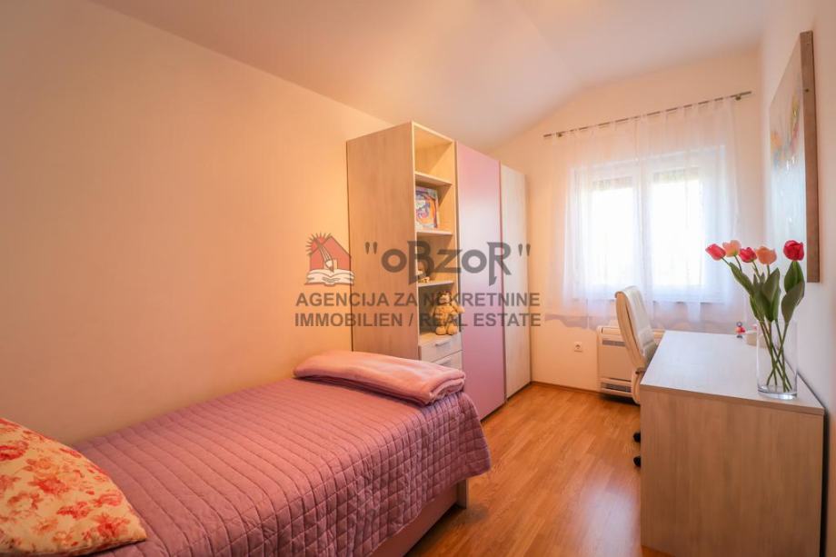 Na katu se nalazi jedan komforan trosoban stan koji se sastoji od kuhinje s blagavaonom i dnevnim boravkom, hodnika, tri sobe, dva kupatila s toaletom i velike terase sa pogledom na more. Pristup katu je omogućen unutarnjim stubištem.