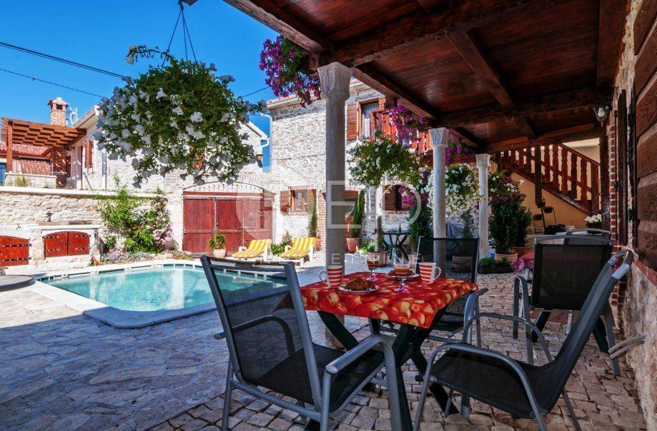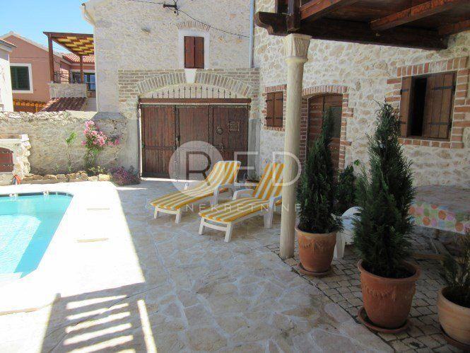 U dvoru kuće nalazi se prostrana terasa sa sunčalištem i manjim bazenom te roštiljom.