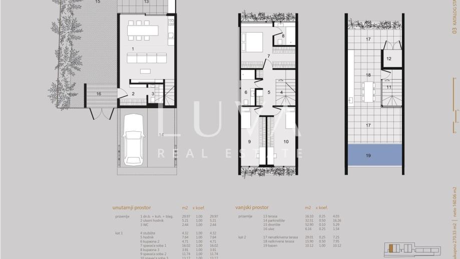 Drugi kat – nenatkrivena terasa s bazenom, natkrivena terasa s prostorom za druženje i blagovanje, tehnička soba/spremište
