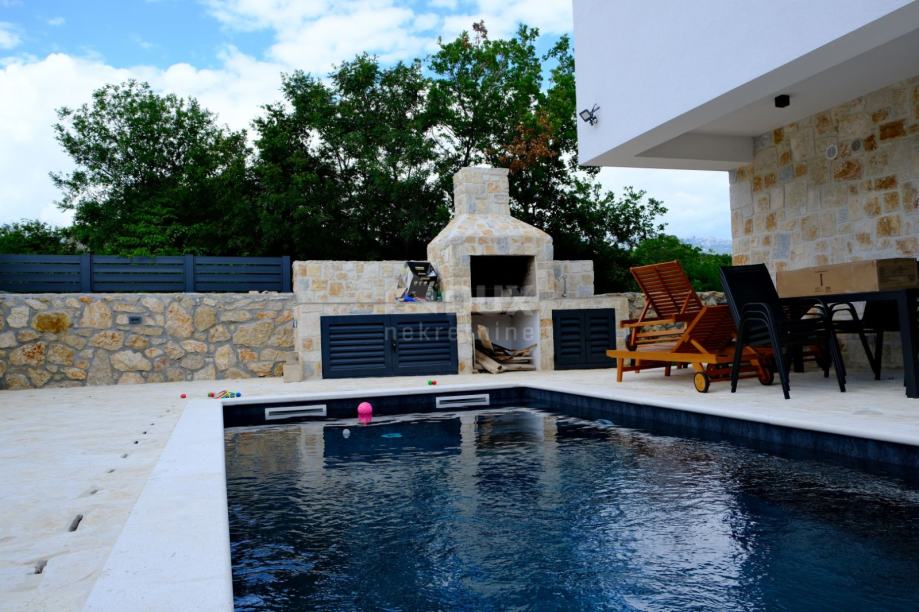 Vanjski prostor nudi savršen ambijent za opuštanje i zabavu s bazenom, natkrivenom terasom i roštiljem. Uz to, vila ima četiri parkirna mjesta i ostavu, dodatno povećavajući praktičnost i funkcionalnost.