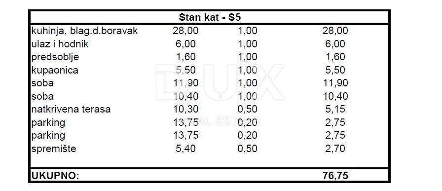 Prodaje se moderan stan s vrtom u izgradnji u predjelu Skročini/Melada u Zadru. Stan stambene površine 63,4 m2 nalazi se u prizemlju manje stambene zgrade s osam jedinica. Sastoji se od dvije spavaće sobe, dnevnog boravka, kuhinje i blagovaonice, hodnika te kupaonice. Stanu pripada jedna natkrivena terasa, spremište u podrumu, te dva vanjska parkirna mjesta. Ukupna korisna vrijednost površine stana zajedno sa svim pripacima iznosi 76,75 m2.