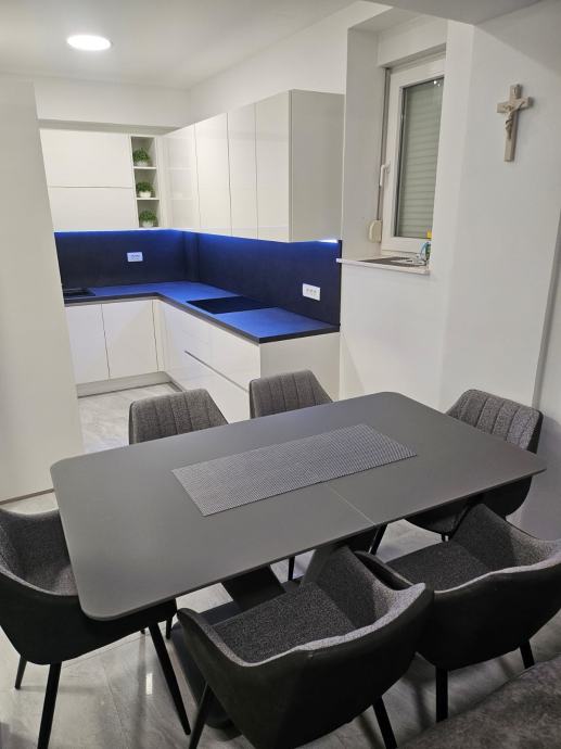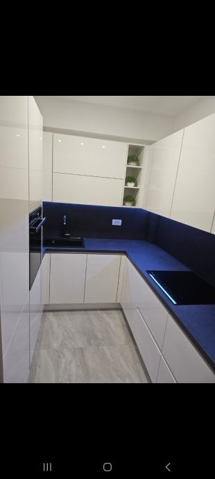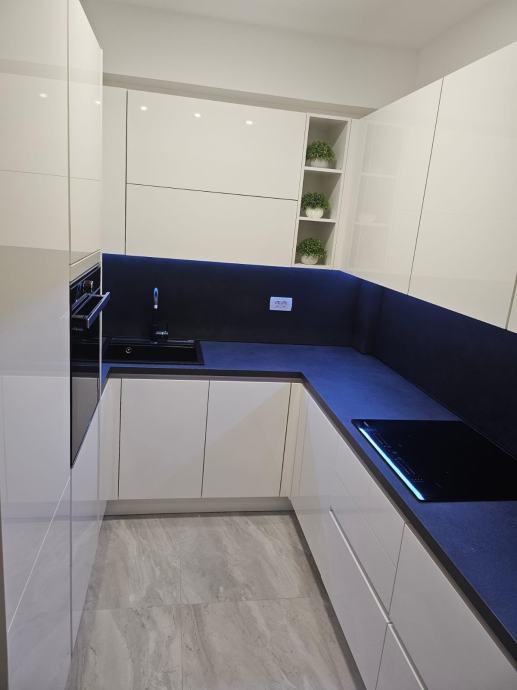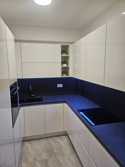 Kuhinja ima ugradbeni frižider, pećnicu, perilicu, napu, indukcijsku ploču za kuhanje, keramički sudoper, te je dužina kuhinje 6 m ( donji elementi) i 6m ( gornji elementi), duboke ladice sa stoperima, otklopno zaklopni elementi itd.