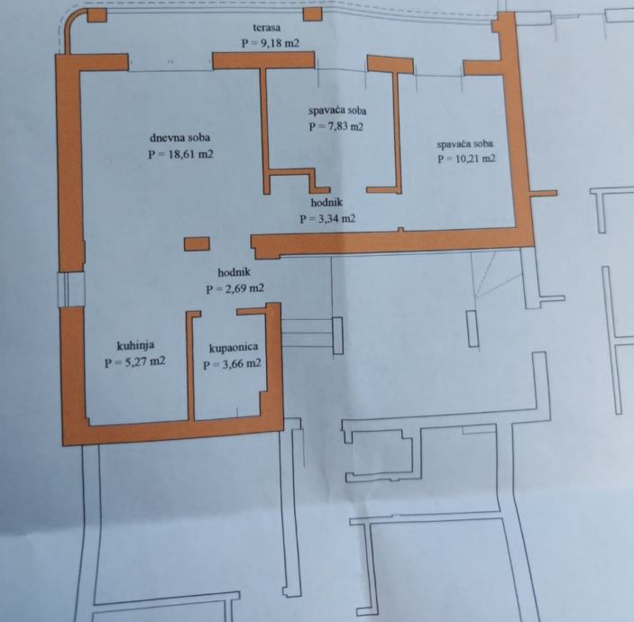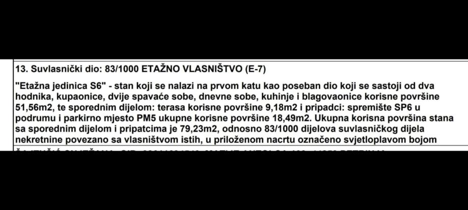 Ukupna površina stana sa sporednim dijelom i pripatcima iznosi 79,23m2.