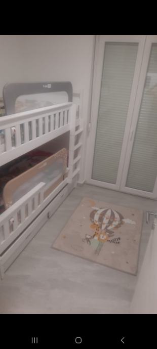 Spavaća soba 1 ima bračni ležaj 160x200 cm, 2 noćna ormarića, te ormar po mjeri, spavaća soba 2, ima krevet na kat dimenzija 90x200, te još jedan pomoćni ležaj, i veliki ormar dimenzija 270x240.