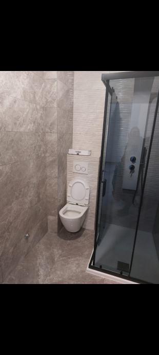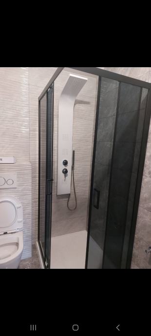 Kupaonica ima tuš kabinu 80x120, s masažnim stupom, ugradbena školjka( geberit), umivaonik s 2 ladice, ormarić te samsung perilicu rublja.