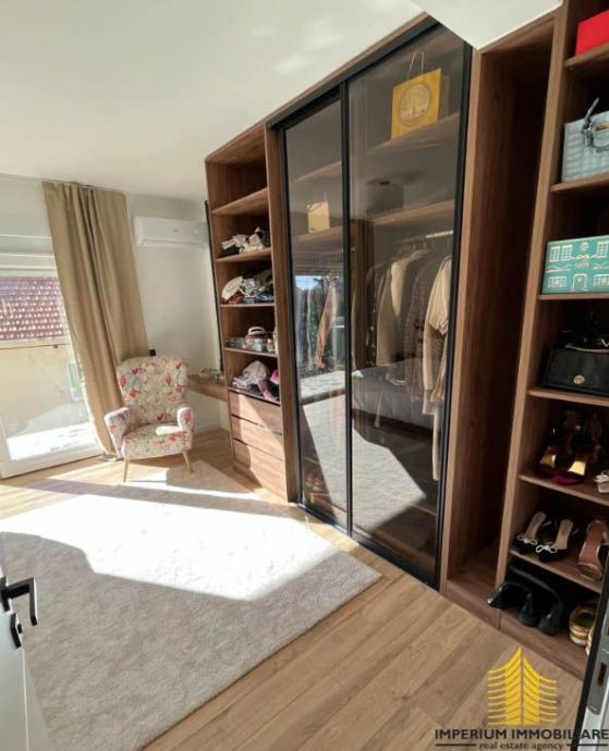 Interijer kuće obuhvaća prostrani dnevni boravak, kuhinju i blagovaonicu, tri udobne spavaće sobe, dvije moderno uređene kupaonice, balkon koji nudi osvježavajući pogled, krovnu terasu savršenu za opuštanje na otvorenom te uređeni vrt.