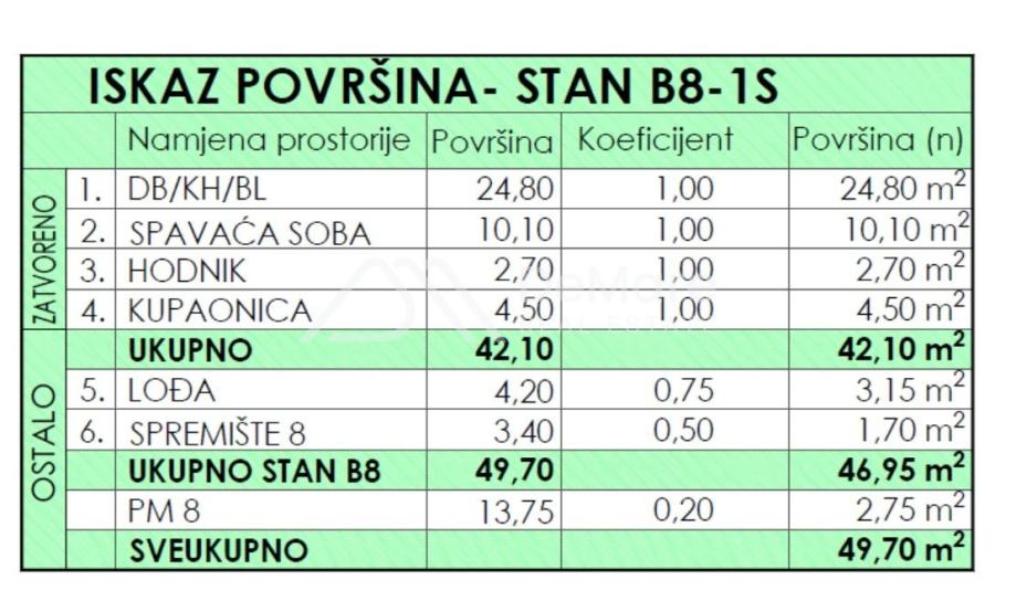 Unutarnja stambena površina iznosi 42,10 m2, a ukupna obračunska korisna vrijednost površine stana s pripadcima iznosi 49,70 m2.