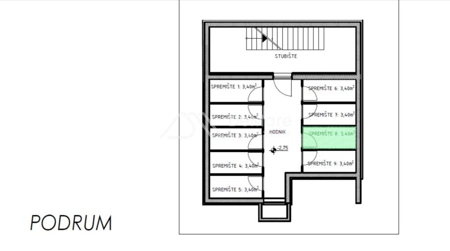 Zgrada ima 4 etaže / podrum, prizemlje, prvi i drugi kat, sa ukupno 9 stambenih jedinica. U podzemnoj etaži nalaze se ostave, a parkirna mjesta smještena su na uređenom parkiralištu na okućnici zgrade. Svakom stanu pripada 1 parkirno mjesto.