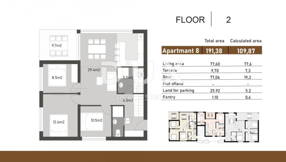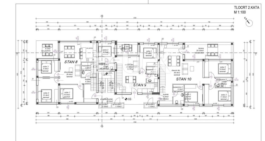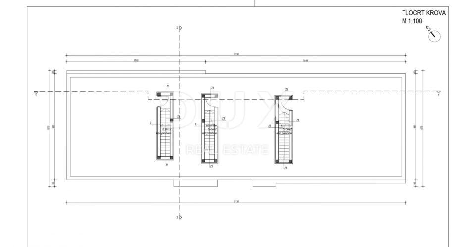 Prodaje se penthouse u izgradnji u Ninu pokraj Zadra. Stan ukupne stambene površine 77,60 m2 nalazi se na drugom katu manje stambene zgrade s 10 stambenih jedinica. Sastoji se od dnevnog boravka, kuhinje i blagovaonice, tri spavaće sobe, kupaonice i terase od 9,70 m2 s koje se pruža prekrasan pogled na more. Stanu pripada i krovna terasa površine 77,06 m2, ostava, te dva parkirna mjesta u dvorištu zgrade, pa sveukupna površina s pripacima iznosi 109,87 m2.