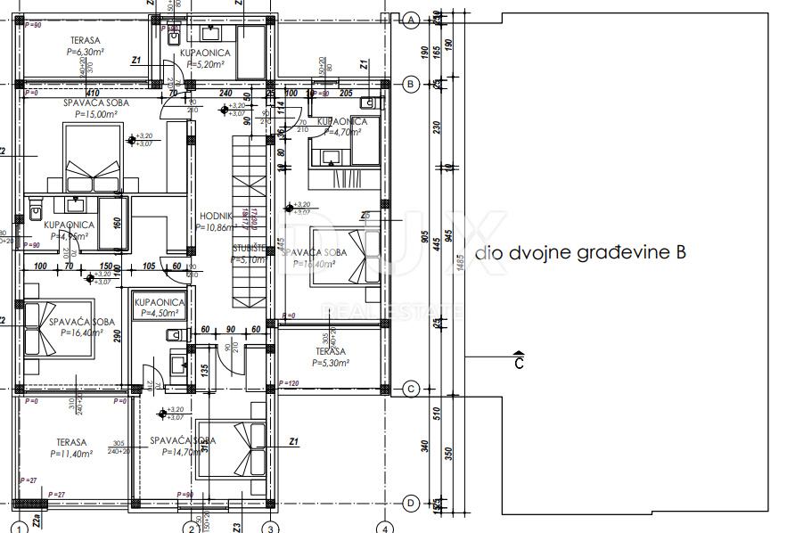 Unutarnje stubište vodi na kat, gdje se nalaze četiri spavaće sobe i četiri kupaonice. Dvije sobe imaju vlastite kupaonice, dok sve četiri sobe imaju izlaz na terase koje nude predivan pogled. Ova dvojna kuća također posjeduje i prostranu krovnu terasu, savršeno mjesto za opuštanje, gdje je predviđena instalacija saune i jacuzzija.