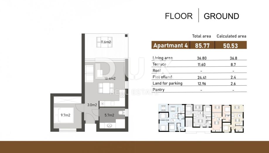 Prodaje se stan u izgradnji u Ninu pokraj Zadra. Stan ukupne stambene površine 36,80 m2 nalazi se u prizemlju manje stambene zgrade s 10 stambenih jedinica. Sastoji se od dnevnog boravka, kuhinje i blagovaonice, spavaće sobe, kupaonice i terase od 11,60 m2. Stanu pripada i vrt od 24,41 m2 te jedno parkirno mjesto u dvorištu zgrade, pa sveukupna površina s pripacima iznosi 50,53 m2.