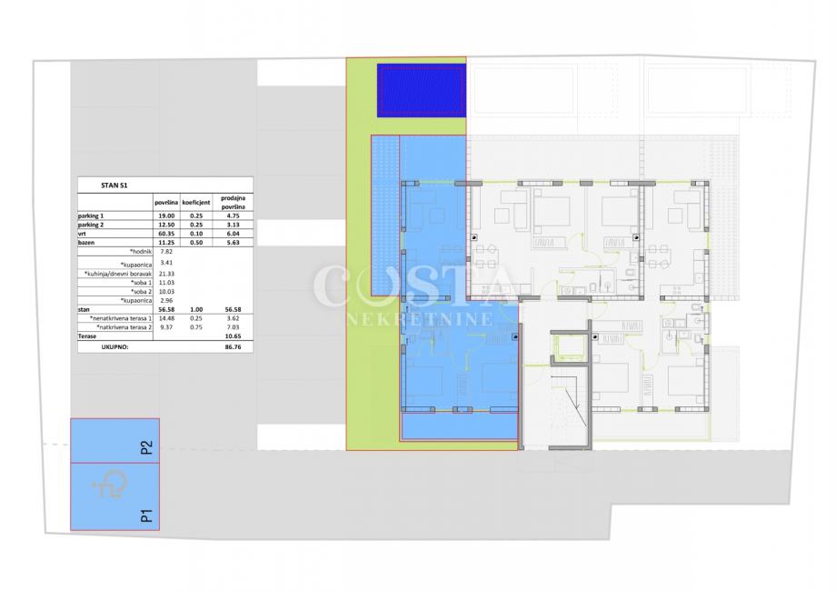 Prodaje se stan s bazenom u izgradnji u Ninu pokraj Zadra. Stan stambene površine 56,58 m2 nalazi se u prizemlju stambene zgrade s 10 jedinica te s liftom. Stan se sastoji od dnevnog boravka, kuhinje i blagovaonice, dvije spavaće sobe, dvije kupaonice i hodnika, te jedna natkrivena terasa od dodatnih 9,37 m2 i nenatkrivena terasa od 14,48 m2. Stanu pripada i vrt od 60,35 m2, privatni bazen od 11,25 m2, te parkirnog mjesta u dvorištu zgrade. Sveukupna prodajna površina stana zajedno s pripacima iznosi 86,76 m2. Stan je kompletno klimatiziran, a u kupaonicama je provedeno podno grijanje. Stan je prilagođen i za osobe s invaliditetom.