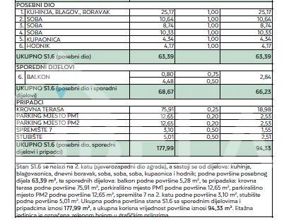 Ukupna podna površina stana S1.6 sa sporednim dijelovima i pripadcima iznosi 177,99 m², a ukupna korisna vrijednost površine iznosi 94,33 m².