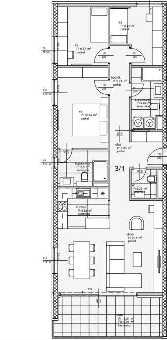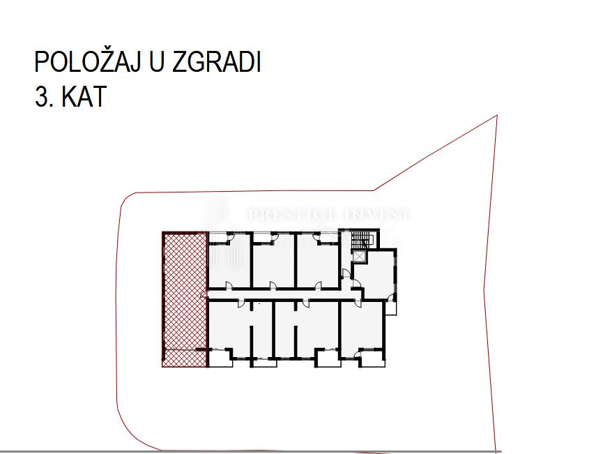 Trosoban stan je smješten na 3. katu zgrade. Ukupna netto površina stana iznosi 124m2. Sastoji se od ulaza, hodnika, kuhinje s blagovaonom, dnevnog boravka, tri spavaće sobe, dvije kupaone i lođe.
