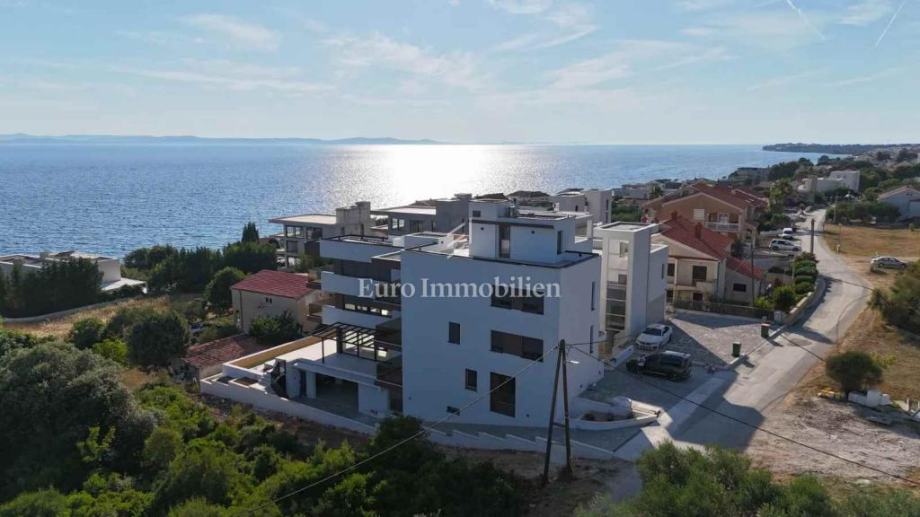 PRIZEMLJE - S1 se prostire preko cijele etaže i ima neto 227,22 m2. Sastoji se od 4 spavaće sobe, 3 kupaonice, gospodarstva, dnevnog boravka s blagovaonicom i kuhinjom, hodnika, wellnessa i vrta. S dvorištem apartman ukupno ima 404m2 površine. U dvorištu se nalazi velika terasa s pogledom na more, natkrivena pergolom i bazen 13x3 m koji ima grijanje i hlađenje. Apartmanu pripadaju 2 parkirališna mjesta u garaži i jedno mjesto ispred zgrade te spremište od 20 m2. Grijanje je podno preko dizalice topline, a svaka soba ima split klimatizacijsku jedinicu koja grije i hladi. Apartman će se prodavati namješten. - 913500 €