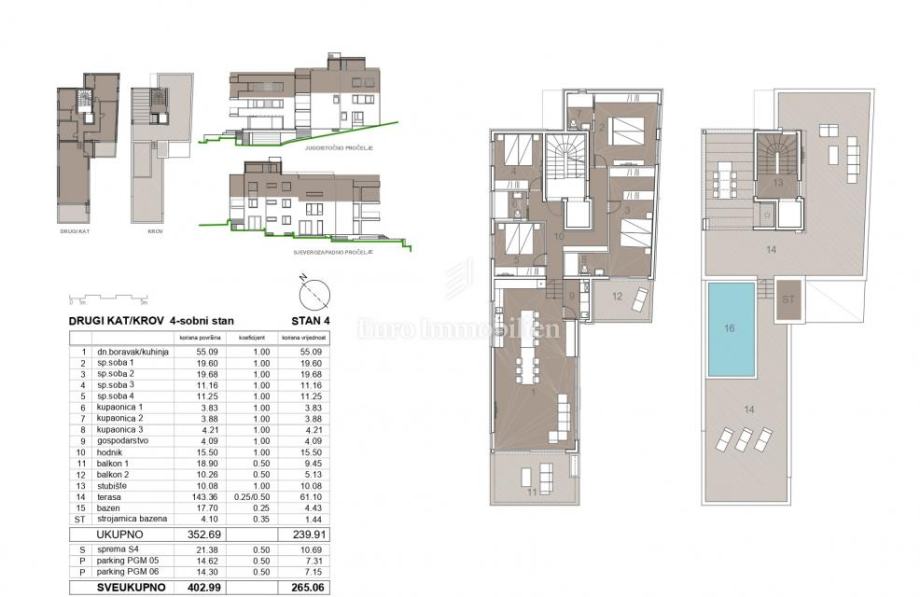 2. KAT - S4 se prostire preko cijele etaže i krovne terase, ima neto 265,06 m2, a ukupna korisna površina mu iznosi 404m2. Sastoji se od 4 spavaće sobe, 3 kupaonice, dnevnog boravka s blagovaonicom i kuhinjom, gospodarstva, hodnika te dvije terase s pogledom na more. Grijanje je podno preko dizalice topline, a svaka soba ima split klimatizacijsku jedinicu koja grije i hladi. Na krovnoj terasi nalazi se lounge prostor s pripremom za kućno kino, kuhinjsko-blagovaonski dio natkriven pergolom, sunčalište i infinity bazen 6x3 m grijan i hlađen. - 1319500 €