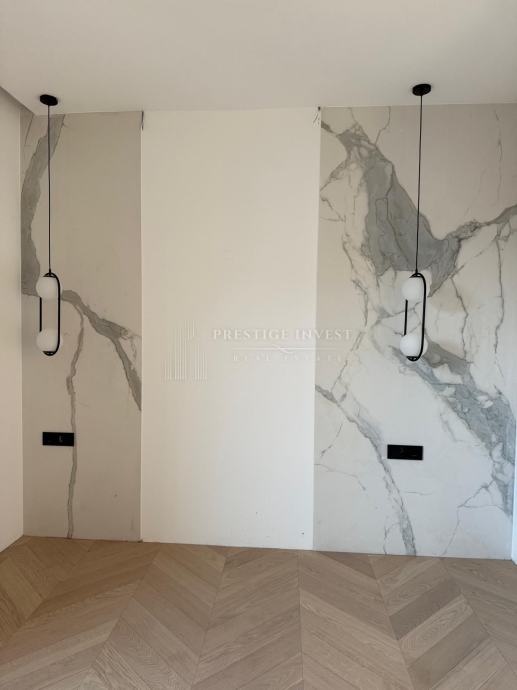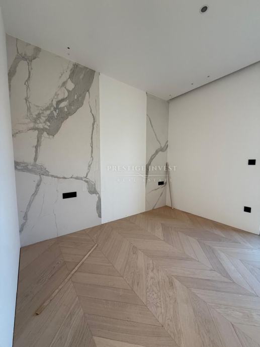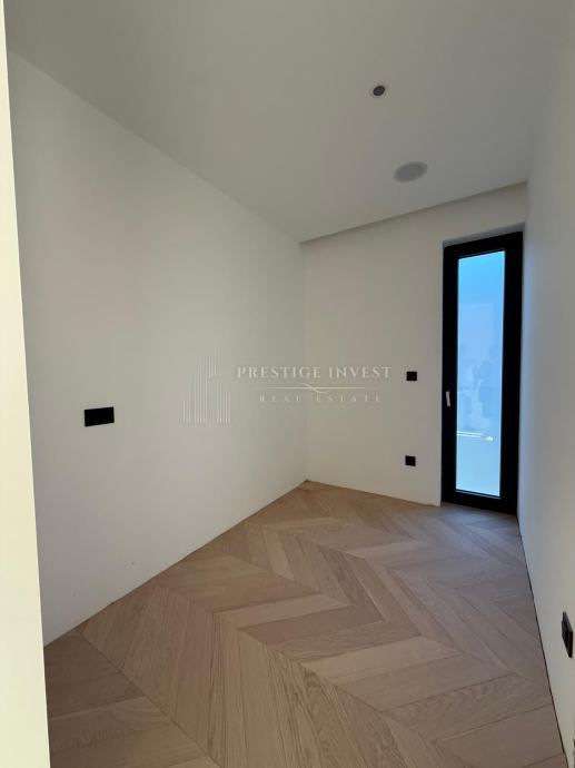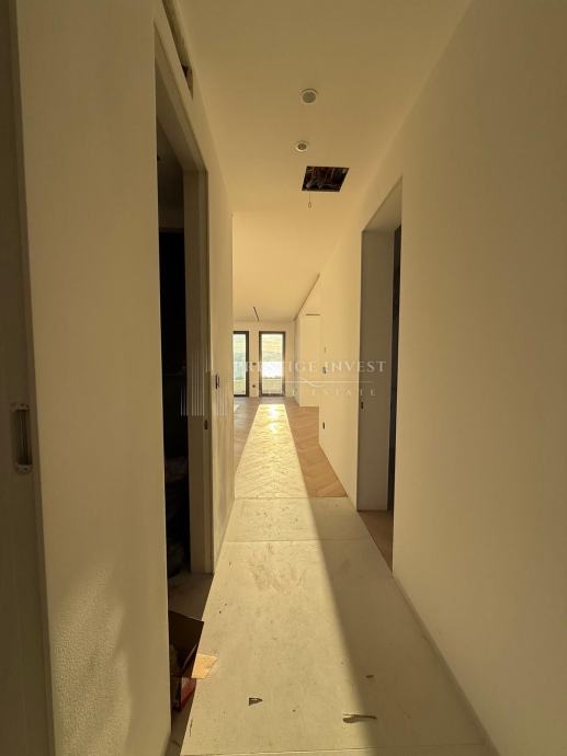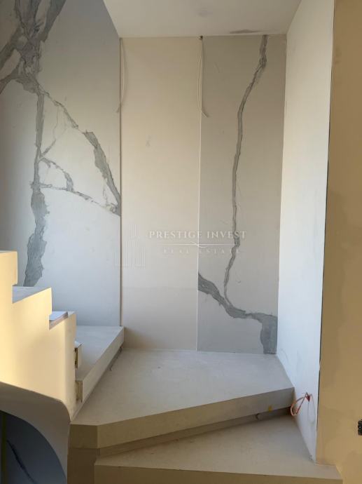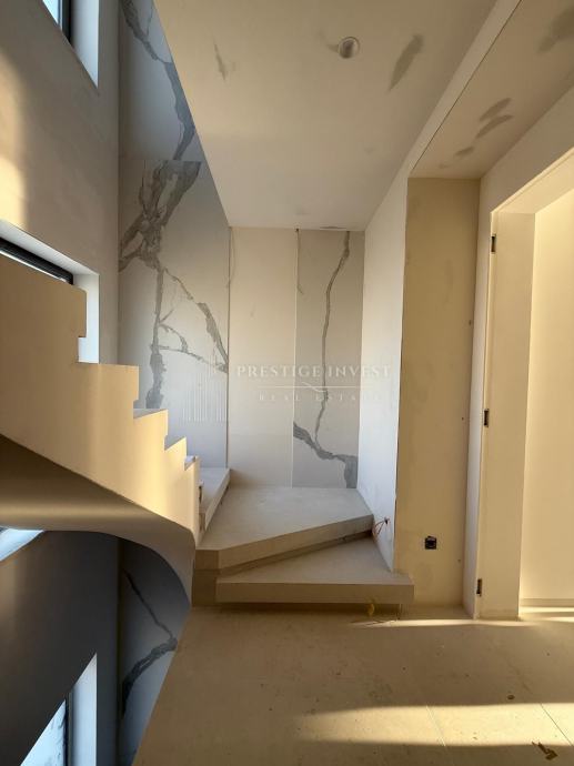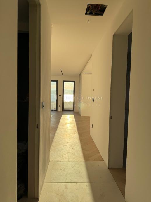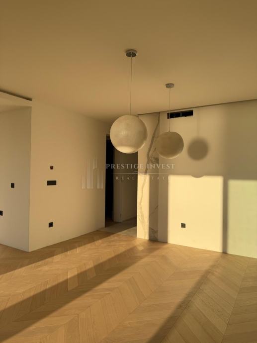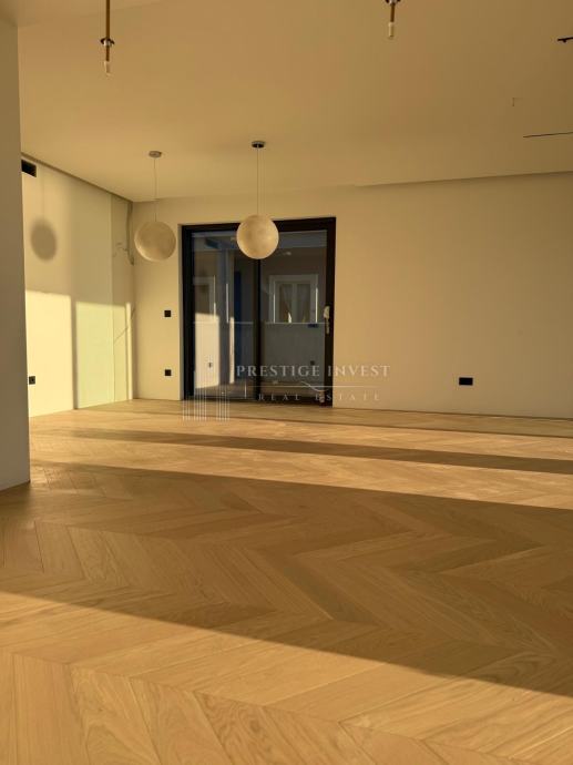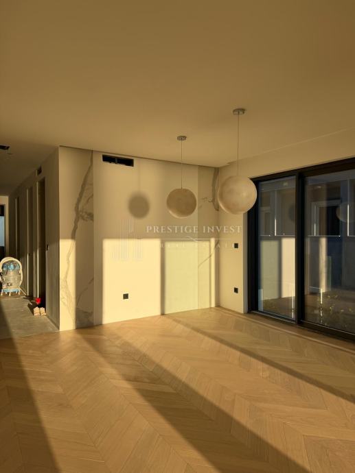 Ovaj trosoban stan proteže se na više etaža, uključujući podrum, prizemlje(Ulazni dio) i prvi kat te krovnu terasu. Sastoji se od prostranog hodnika, tri spavaće sobe, tri kupaonice, dva WC-a, wellness i teretane, te velikog dnevnog boravka spojenog s kuhinjom i blagovaonicom.
