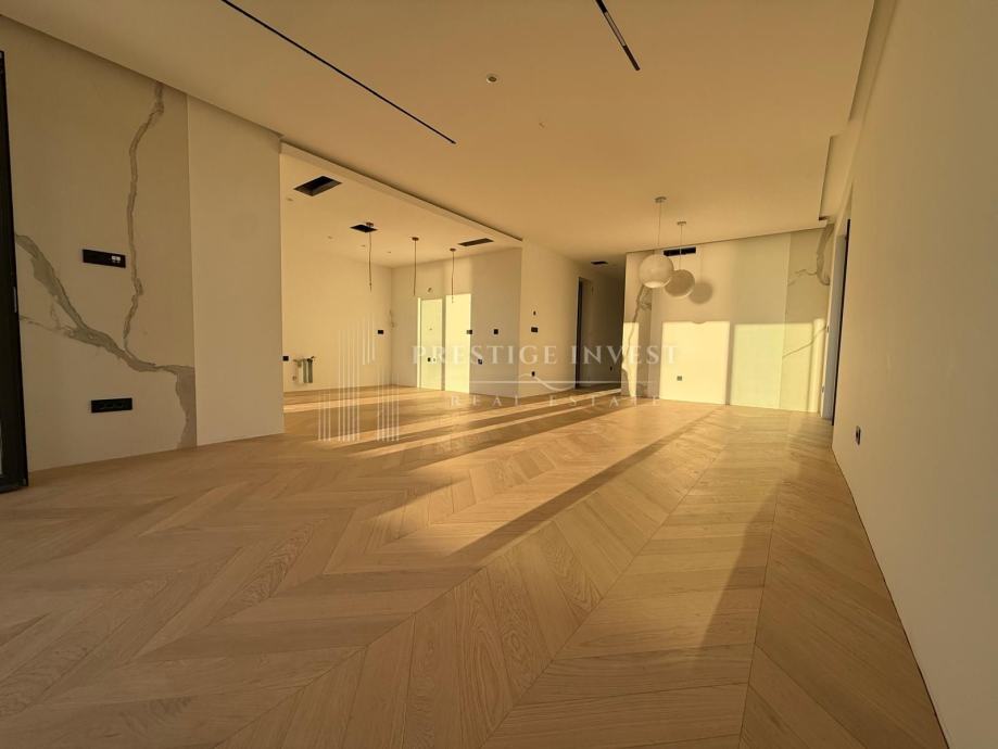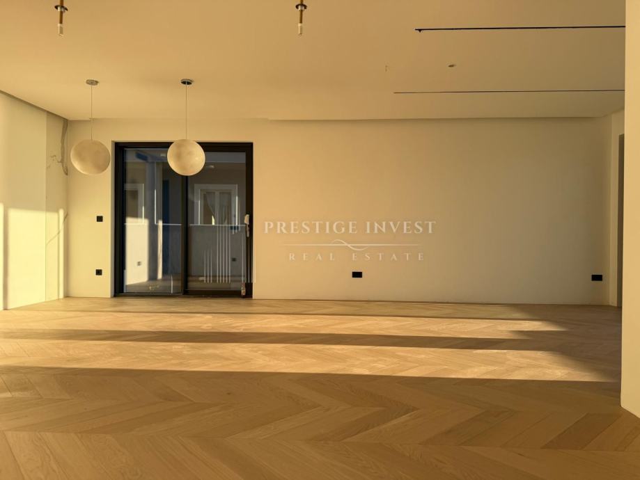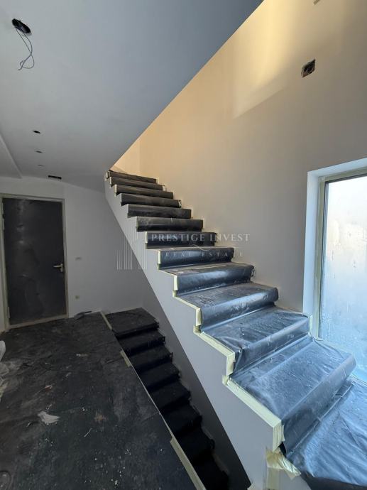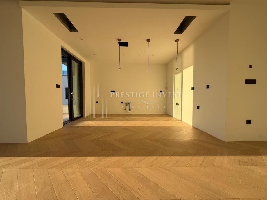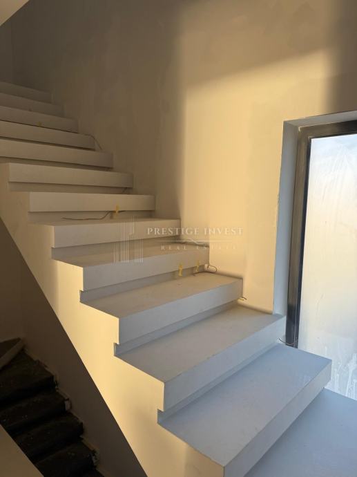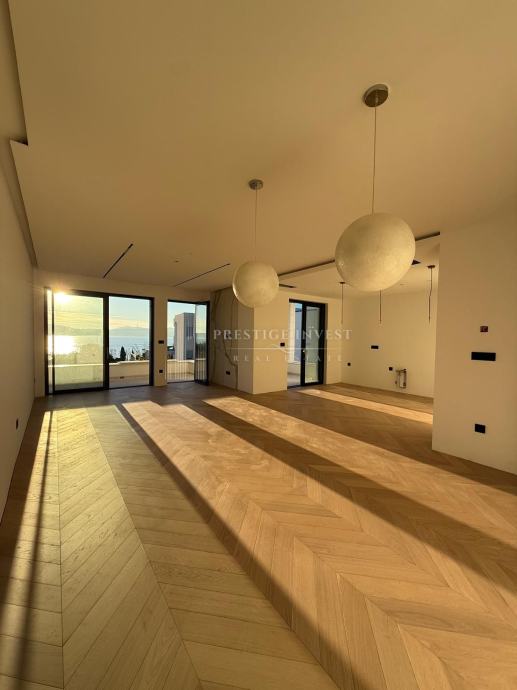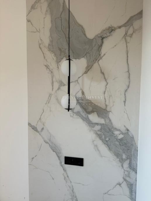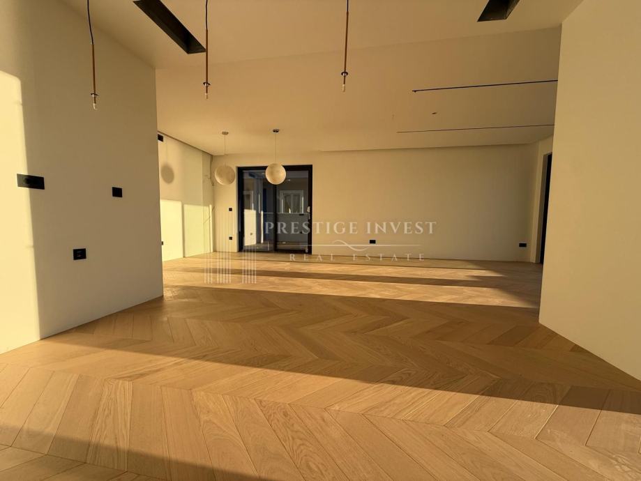 Ovaj trosoban stan proteže se na više etaža, uključujući podrum, prizemlje(Ulazni dio) i prvi kat te krovnu terasu. Sastoji se od prostranog hodnika, tri spavaće sobe, tri kupaonice, dva WC-a, wellness i teretane, te velikog dnevnog boravka spojenog s kuhinjom i blagovaonicom.