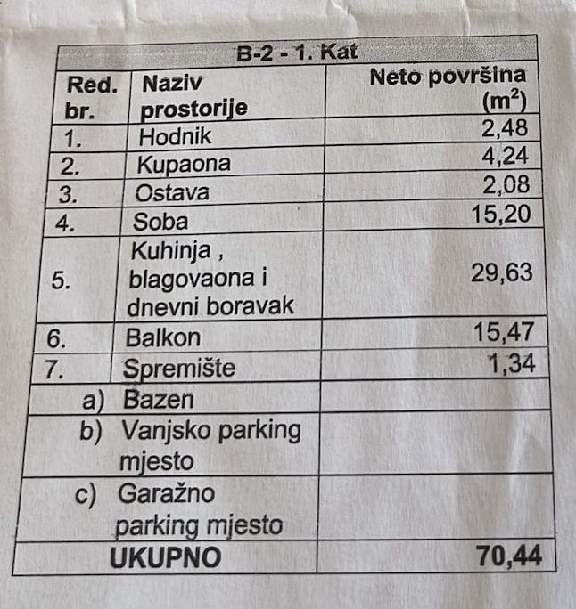 Stan se sastoji od ulaznog hodnika, prostranog dnevnog boravka spojenog staklenim stijenama sa balkonom, kuhinje i blagovaonice, ostave, 1 spavaće sobe i kupaonice. Stanu još pripada i spremište, garažno parkirno mjesto iz kojeg se liftom dolazi direktno u stan, te još jedno vanjsko parkirno mjesto.